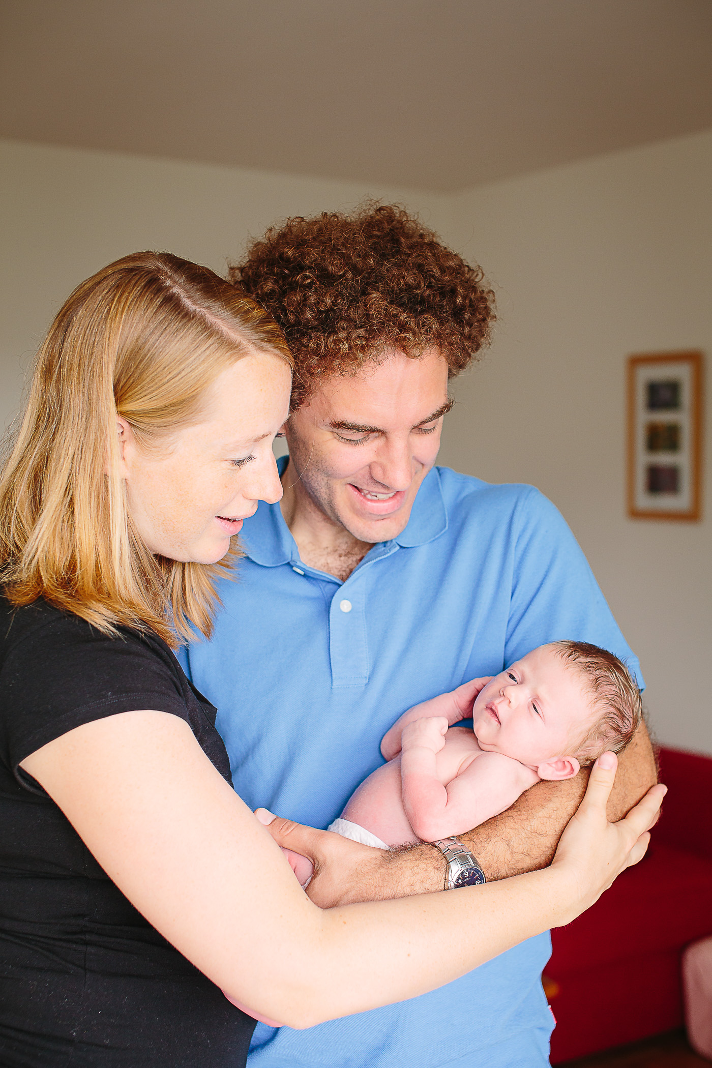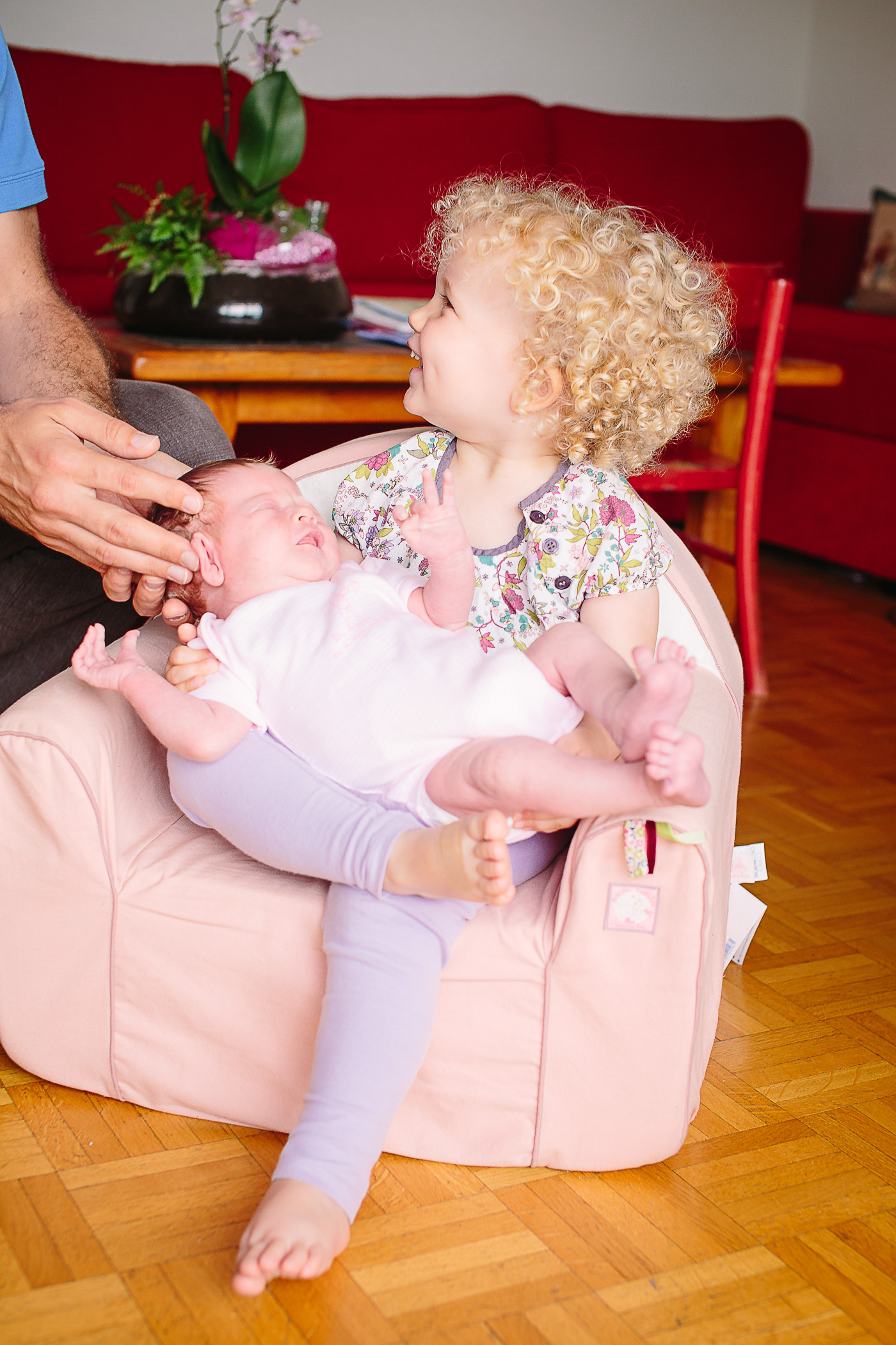Next, we moved into the living room where Dad held the baby, his hands supporting that tiny head with such care. It’s incredible how these fleeting moments—just a look, a small smile—tell a story of new beginnings. Their older daughter joined in, curious and full of energy, bringing her own charm to the photos.